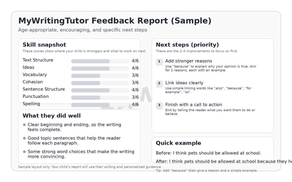 When your child submits a piece of writing, you receive a clear report that shows what they did well and what to work on next.